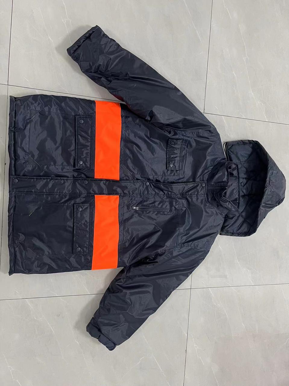 A highly visible raincoat designed with reflective stripes to ensure safety during rainy weather, perfect for working outdoors in low-light conditions.